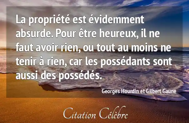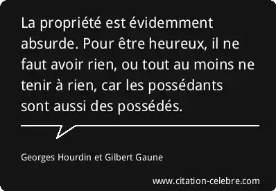 La propriété est évidemment absurde. Pour être heureux, il ne faut avoir rien, ou tout au moins ne tenir à rien, car les possédants sont aussi des possédés.