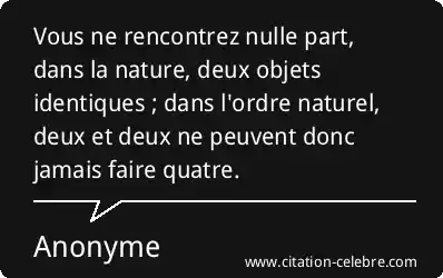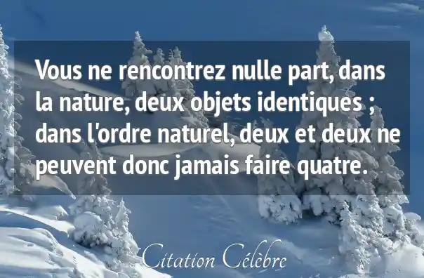 Vous ne rencontrez nulle part, dans la nature, deux objets identiques ; dans l'ordre naturel, deux et deux ne peuvent donc jamais faire quatre.