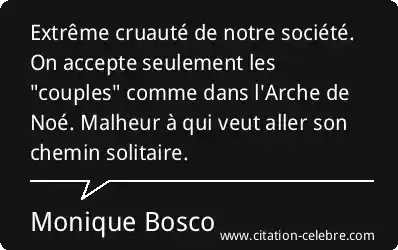 Extrême cruauté de notre société. On accepte seulement les "couples" comme dans l'Arche de Noé. Malheur à qui veut aller son chemin solitaire.