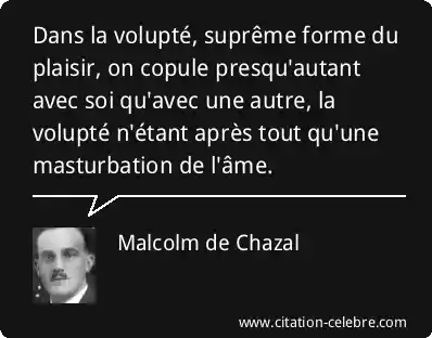 Dans la volupté, suprême forme du plaisir, on copule presqu'autant avec soi qu'avec une autre, la volupté n'étant après tout qu'une masturbation de l'âme.