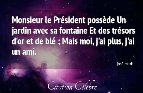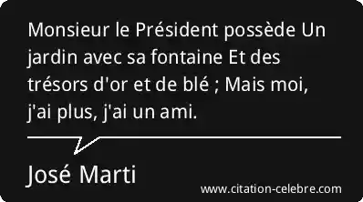 Monsieur le Président possède Un jardin avec sa fontaine Et des trésors d'or et de blé ; Mais moi, j'ai plus, j'ai un ami.