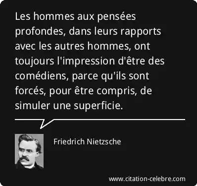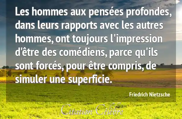 Les hommes aux pensées profondes, dans leurs rapports avec les autres hommes, ont toujours l'impression d'être des comédiens, parce qu'ils sont forcés, pour être compris, de simuler une superficie.