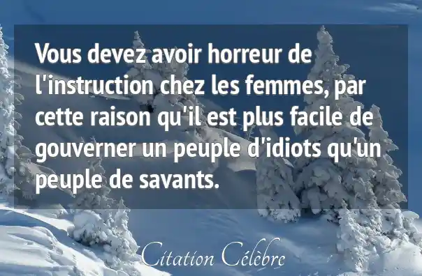 Vous devez avoir horreur de l'instruction chez les femmes, par cette raison qu'il est plus facile de gouverner un peuple d'idiots qu'un peuple de savants.