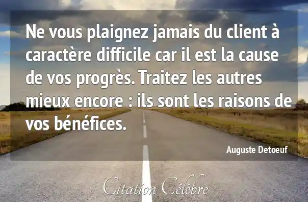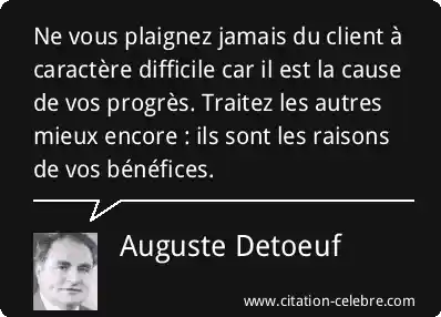 Ne vous plaignez jamais du client à caractère difficile car il est la cause de vos progrès. Traitez les autres mieux encore : ils sont les raisons de vos bénéfices.
