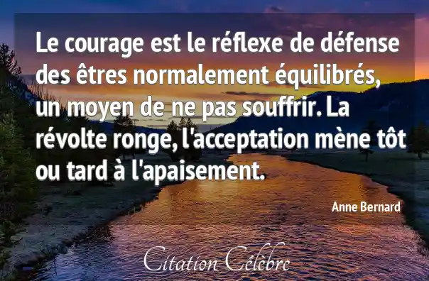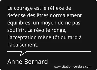 Le courage est le réflexe de défense des êtres normalement équilibrés, un moyen de ne pas souffrir. La révolte ronge, l'acceptation mène tôt ou tard à l'apaisement.