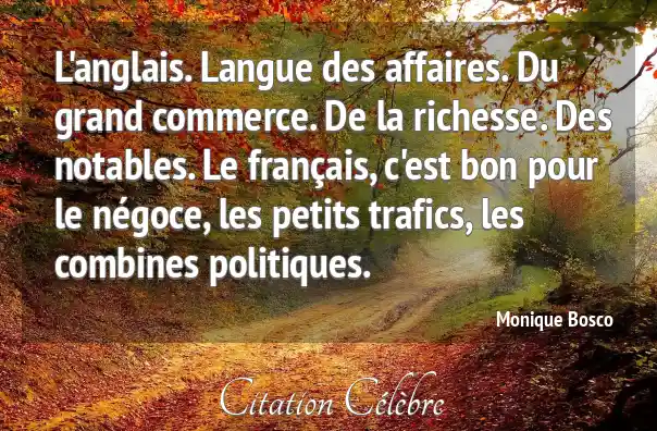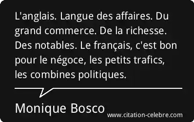 L'anglais. Langue des affaires. Du grand commerce. De la richesse. Des notables. Le français, c'est bon pour le négoce, les petits trafics, les combines politiques.