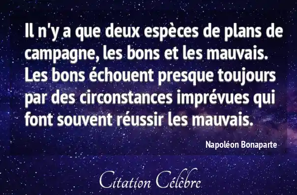 Il n'y a que deux espèces de plans de campagne, les bons et les mauvais. Les bons échouent presque toujours par des circonstances imprévues qui font souvent réussir les mauvais.