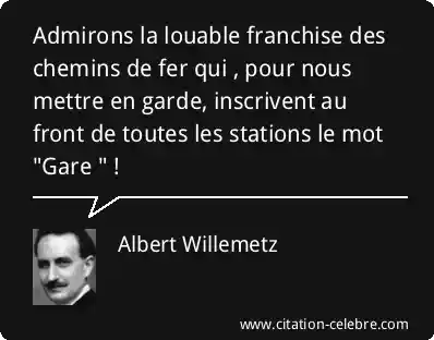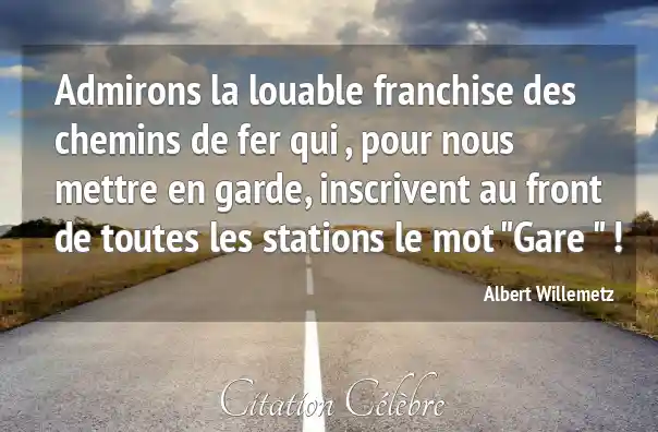 Admirons la louable franchise des chemins de fer qui , pour nous mettre en garde, inscrivent au front de toutes les stations le mot "Gare " !