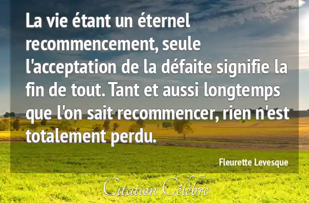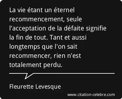 La vie étant un éternel recommencement, seule l'acceptation de la défaite signifie la fin de tout. Tant et aussi longtemps que l'on sait recommencer, rien n'est totalement perdu.