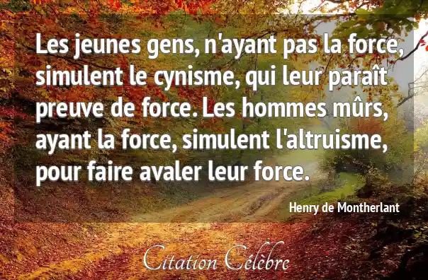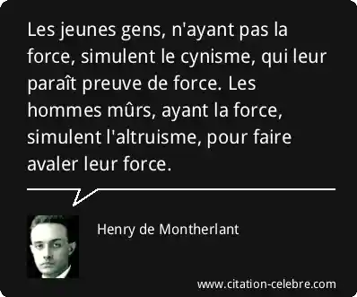 Les jeunes gens, n'ayant pas la force, simulent le cynisme, qui leur paraît preuve de force. Les hommes mûrs, ayant la force, simulent l'altruisme, pour faire avaler leur force.