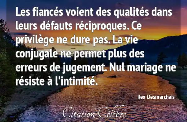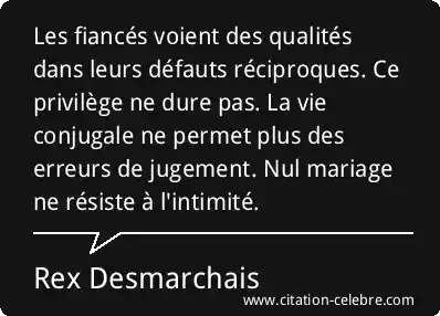 Les fiancés voient des qualités dans leurs défauts réciproques. Ce privilège ne dure pas. La vie conjugale ne permet plus des erreurs de jugement. Nul mariage ne résiste à l'intimité.