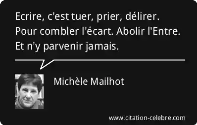 Ecrire, c'est tuer, prier, délirer. Pour combler l'écart. Abolir l'Entre. Et n'y parvenir jamais.