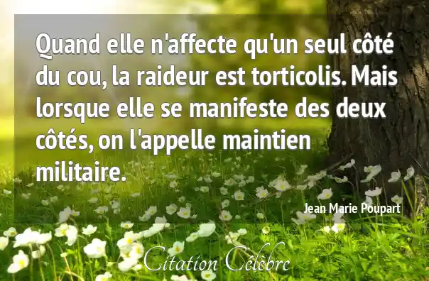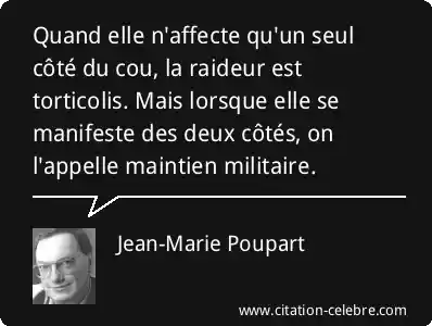 Quand elle n'affecte qu'un seul côté du cou, la raideur est torticolis. Mais lorsque elle se manifeste des deux côtés, on l'appelle maintien militaire.
