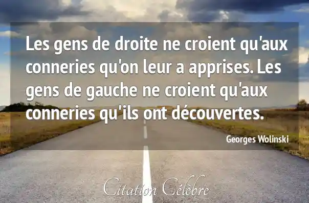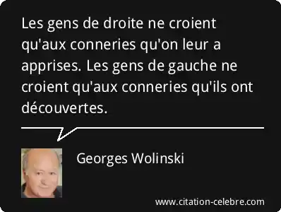 Les gens de droite ne croient qu'aux conneries qu'on leur a apprises. Les gens de gauche ne croient qu'aux conneries qu'ils ont découvertes.