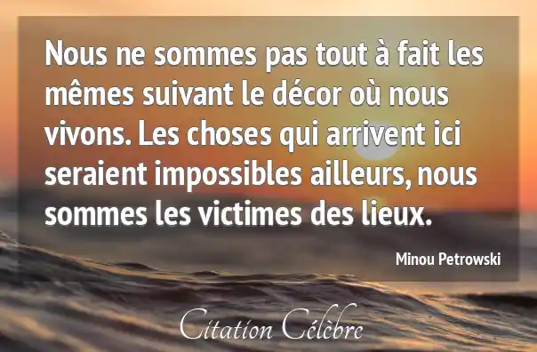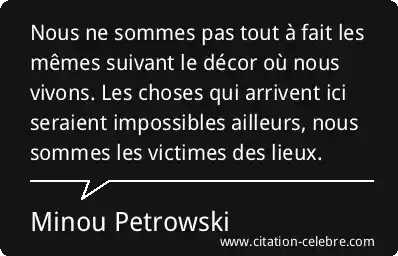 Nous ne sommes pas tout à fait les mêmes suivant le décor où nous vivons. Les choses qui arrivent ici seraient impossibles ailleurs, nous sommes les victimes des lieux.