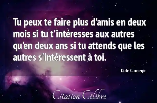 Tu peux te faire plus d'amis en deux mois si tu t'intéresses aux autres qu'en deux ans si tu attends que les autres s'intéressent à toi.
