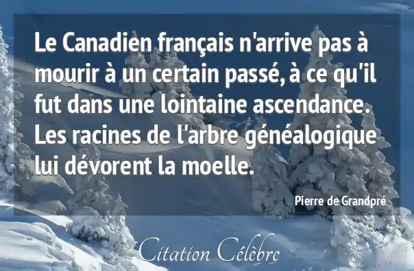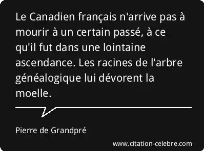 Le Canadien français n'arrive pas à mourir à un certain passé, à ce qu'il fut dans une lointaine ascendance. Les racines de l'arbre généalogique lui dévorent la moelle.
