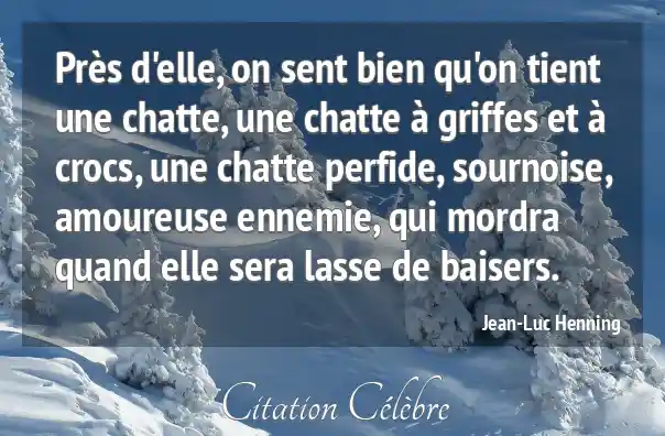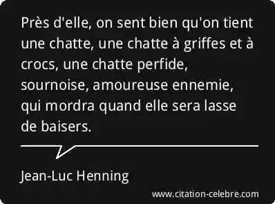 Près d'elle, on sent bien qu'on tient une chatte, une chatte à griffes et à crocs, une chatte perfide, sournoise, amoureuse ennemie, qui mordra quand elle sera lasse de baisers.