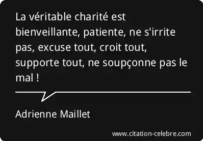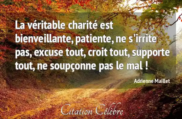 La véritable charité est bienveillante, patiente, ne s'irrite pas, excuse tout, croit tout, supporte tout, ne soupçonne pas le mal !