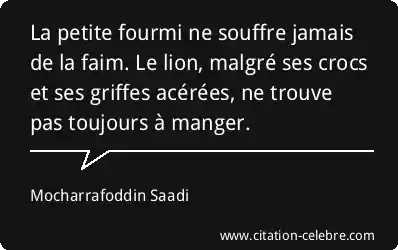 La petite fourmi ne souffre jamais de la faim. Le lion, malgré ses crocs et ses griffes acérées, ne trouve pas toujours à manger.