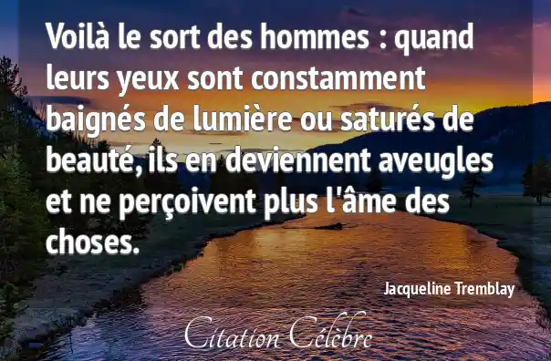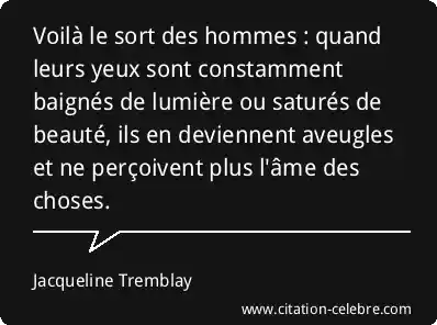 Voilà le sort des hommes : quand leurs yeux sont constamment baignés de lumière ou saturés de beauté, ils en deviennent aveugles et ne perçoivent plus l'âme des choses.