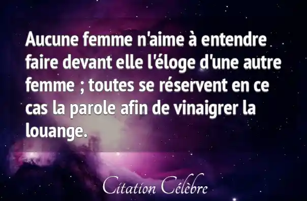 Aucune femme n'aime à entendre faire devant elle l'éloge d'une autre femme ; toutes se réservent en ce cas la parole afin de vinaigrer la louange.