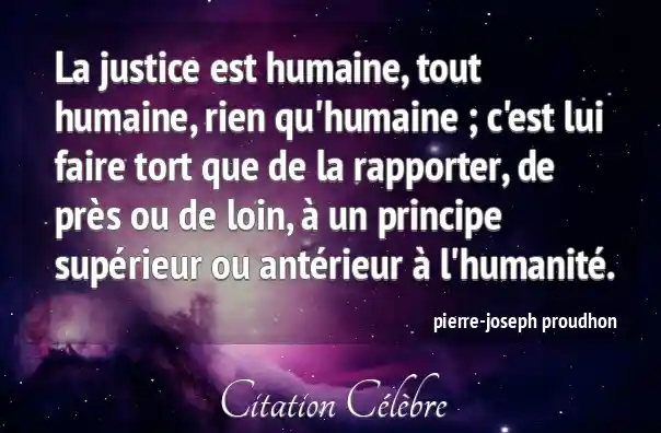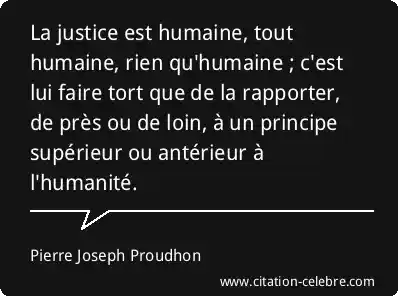 La justice est humaine, tout humaine, rien qu'humaine ; c'est lui faire tort que de la rapporter, de près ou de loin, à un principe supérieur ou antérieur à l'humanité.