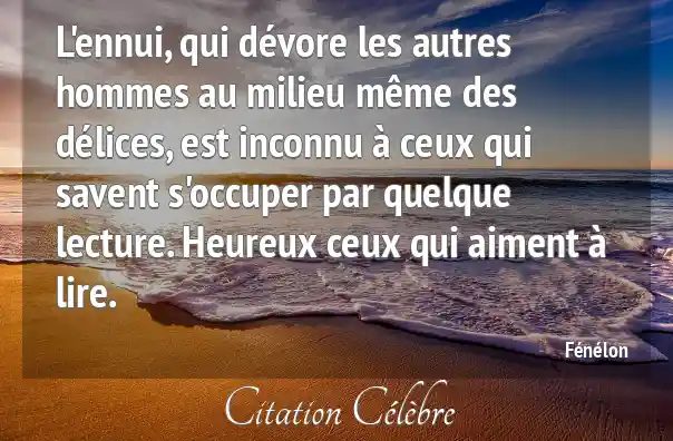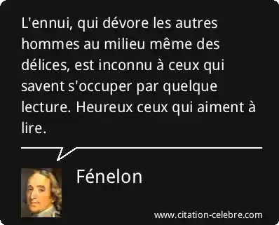 L'ennui, qui dévore les autres hommes au milieu même des délices, est inconnu à ceux qui savent s'occuper par quelque lecture. Heureux ceux qui aiment à lire.