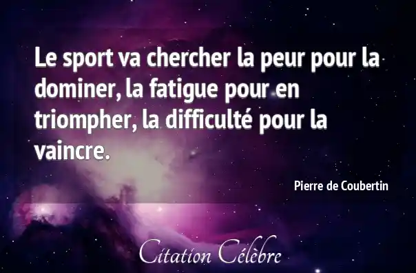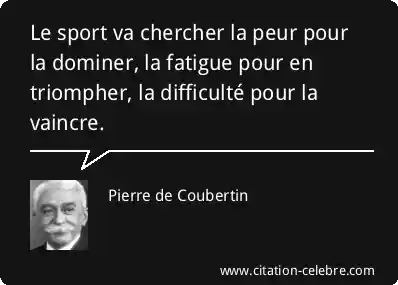Cette célèbre citation de Pierre de Coubertin, le rénovateur des Jeux Olympiques modernes, exprime l'essence même de l'esprit sportif. Elle postule que le sport n'est pas seulement une activité physique, mais une véritable quête intérieure et une confrontation avec soi-même. Elle signifie que l'athlète recherche délibérément les défis et les obstacles – la peur, la fatigue, la difficulté – non pas pour les subir, mais pour les dépasser, les maîtriser et en sortir victorieux. C'est une ode à la volonté et à la force de caractère que le sport permet de développer.