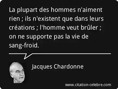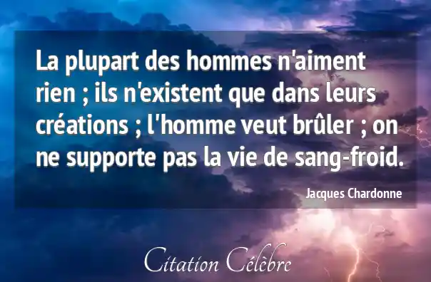 La plupart des hommes n'aiment rien ; ils n'existent que dans leurs créations ; l'homme veut brûler ; on ne supporte pas la vie de sang-froid.