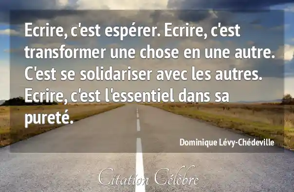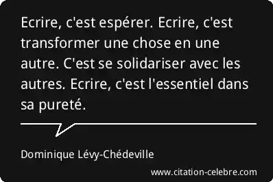 Ecrire, c'est espérer. Ecrire, c'est transformer une chose en une autre. C'est se solidariser avec les autres. Ecrire, c'est l'essentiel dans sa pureté.