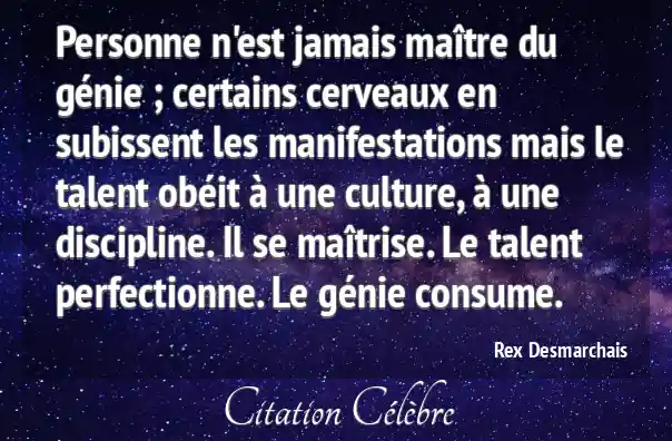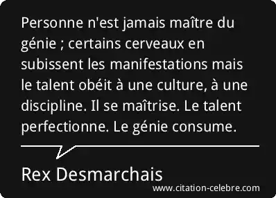 Personne n'est jamais maître du génie ; certains cerveaux en subissent les manifestations mais le talent obéit à une culture, à une discipline. Il se maîtrise. Le talent perfectionne. Le génie consume.