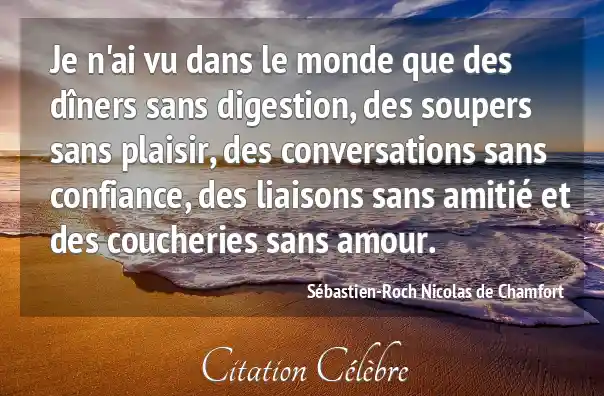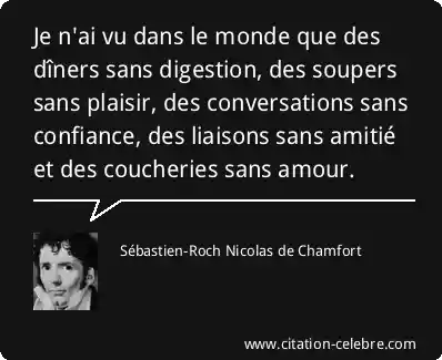 Je n'ai vu dans le monde que des dîners sans digestion, des soupers sans plaisir, des conversations sans confiance, des liaisons sans amitié et des coucheries sans amour.