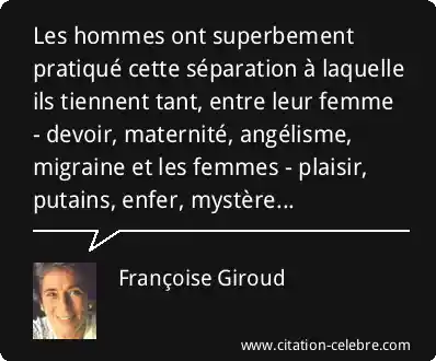 Les hommes ont superbement pratiqué cette séparation à laquelle ils tiennent tant, entre leur femme - devoir, maternité, angélisme, migraine et les femmes - plaisir, putains, enfer, mystère...