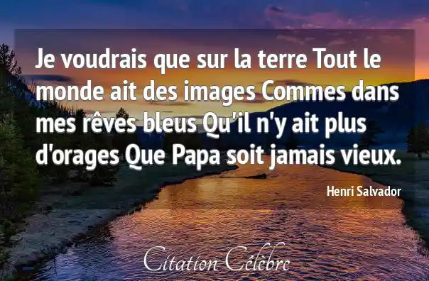 Je voudrais que sur la terre Tout le monde ait des images Commes dans mes rêves bleus Qu'il n'y ait plus d'orages Que Papa soit jamais vieux.