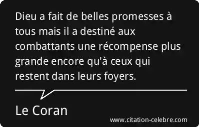 Dieu a fait de belles promesses à tous mais il a destiné aux combattants une récompense plus grande encore qu'à ceux qui restent dans leurs foyers.