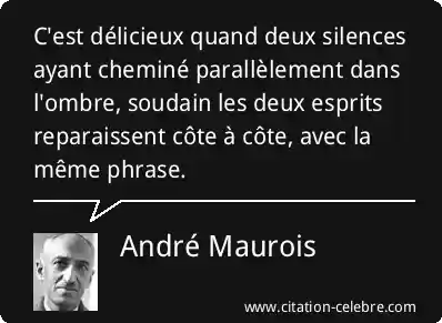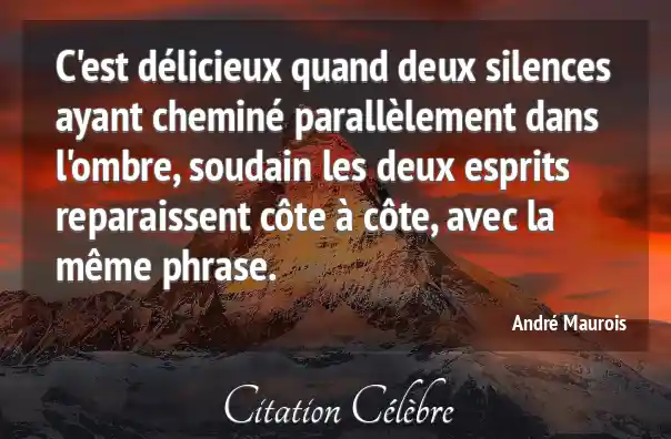 C'est délicieux quand deux silences ayant cheminé parallèlement dans l'ombre, soudain les deux esprits reparaissent côte à côte, avec la même phrase.