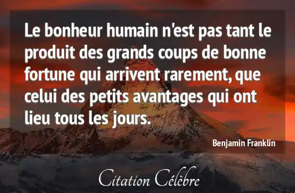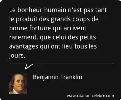 Le bonheur humain n'est pas tant le produit des grands coups de bonne fortune qui arrivent rarement, que celui des petits avantages qui ont lieu tous les jours.