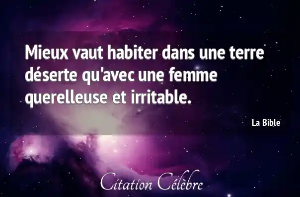 Mieux vaut habiter dans une terre déserte qu'avec une femme querelleuse et irritable.