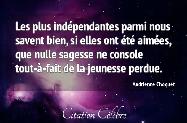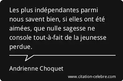 Les plus indépendantes parmi nous savent bien, si elles ont été aimées, que nulle sagesse ne console tout-à-fait de la jeunesse perdue.