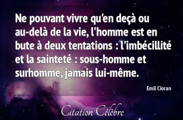 Ne pouvant vivre qu'en deçà ou au-delà de la vie, l'homme est en bute à deux tentations : l'imbécillité et la sainteté : sous-homme et surhomme, jamais lui-même.