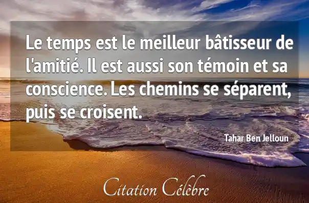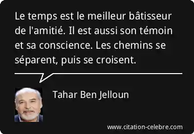 Le temps est le meilleur bâtisseur de l'amitié. Il est aussi son témoin et sa conscience. Les chemins se séparent, puis se croisent.