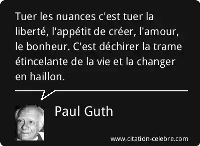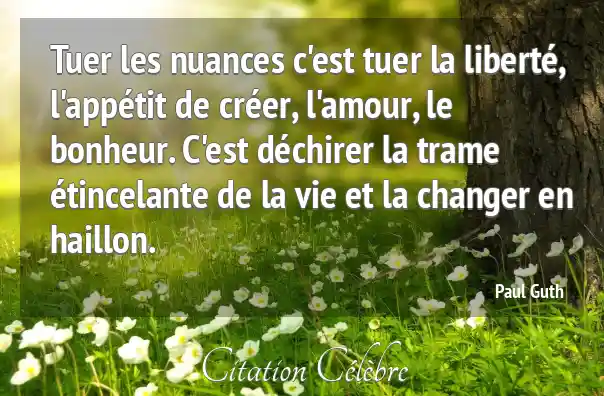 Tuer les nuances c'est tuer la liberté, l'appétit de créer, l'amour, le bonheur. C'est déchirer la trame étincelante de la vie et la changer en haillon.