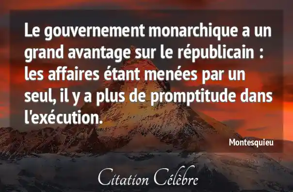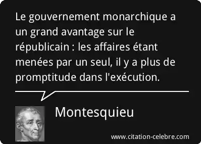 Le gouvernement monarchique a un grand avantage sur le républicain : les affaires étant menées par un seul, il y a plus de promptitude dans l'exécution.