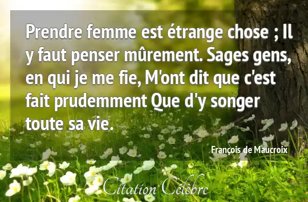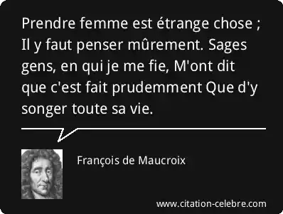 Prendre femme est étrange chose ; Il y faut penser mûrement. Sages gens, en qui je me fie, M'ont dit que c'est fait prudemment Que d'y songer toute sa vie.