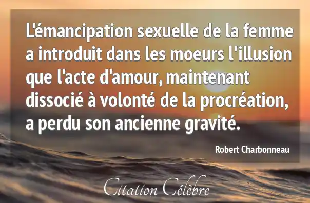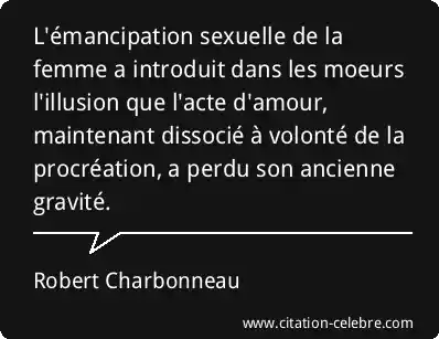 L'émancipation sexuelle de la femme a introduit dans les moeurs l'illusion que l'acte d'amour, maintenant dissocié à volonté de la procréation, a perdu son ancienne gravité.