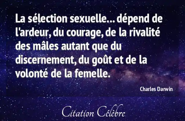 La sélection sexuelle... dépend de l'ardeur, du courage, de la rivalité des mâles autant que du discernement, du goût et de la volonté de la femelle.