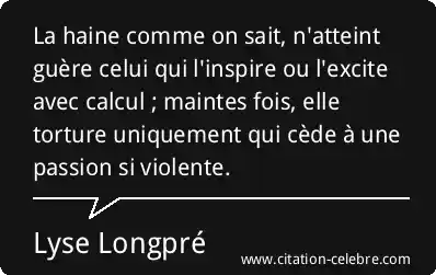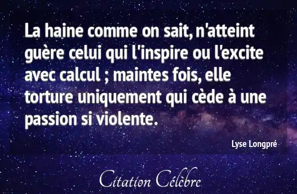 La haine comme on sait, n'atteint guère celui qui l'inspire ou l'excite avec calcul ; maintes fois, elle torture uniquement qui cède à une passion si violente.