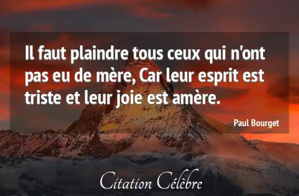 Il faut plaindre tous ceux qui n'ont pas eu de mère, Car leur esprit est triste et leur joie est amère.