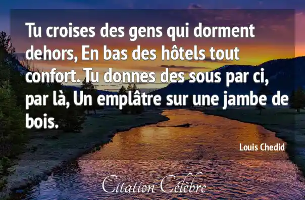 Tu croises des gens qui dorment dehors, En bas des hôtels tout confort. Tu donnes des sous par ci, par là, Un emplâtre sur une jambe de bois.